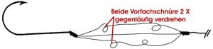 einer 040er Schnur. Damit die einzelnen Schnüre nicht nebeneinander zu liegen kommen, bzw. zusammenkleben, verdreht man 2 der 3 Schnüre 2X gegenläufig in sich und bindet den Haken dann direkt an. Man kann nun über diese Sache denken was man will, eines steht fest.... sie funktioniert hervorragend. Alle großen Fischarten werden mit diesem Vorfach sicher gefangen, weil beim Reißen oder Durchbeißen einer Schnur immer noch 2 Reserveschnüre da sind. Speziell der Karpfen nimmt die 012er Schnur problemlos und die